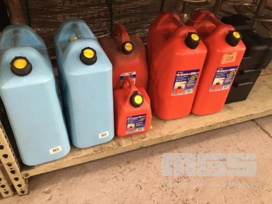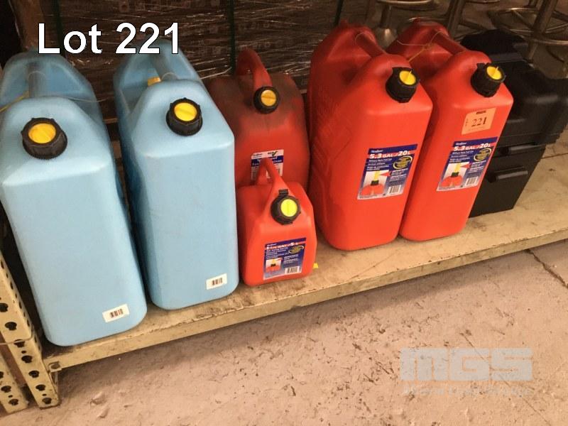 2 x 20 LITRE WATER CANS & 2 x 20 LITRE, 1 x 5 LITRE &, 1 x 18 LITRE FUEL CANS & 2 x BATTERY BOXES