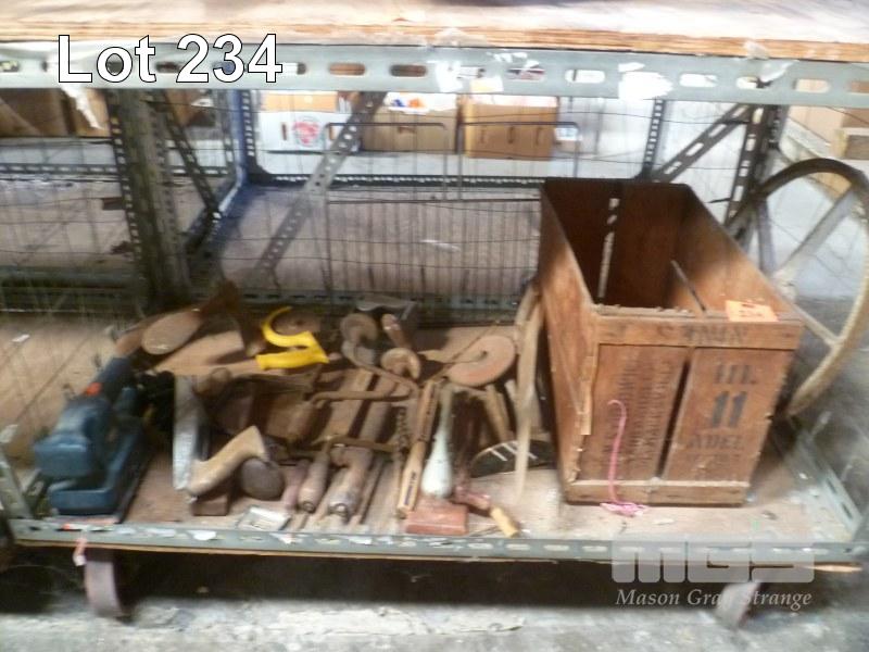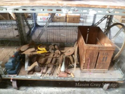 ASSORTED HAND TOOLS, SANDER, TIMBER CRATE & PULLEY WHEEL