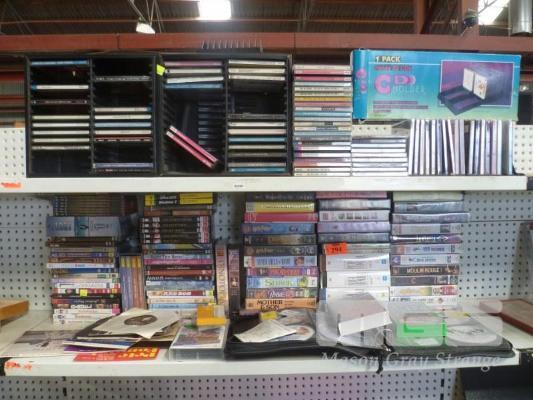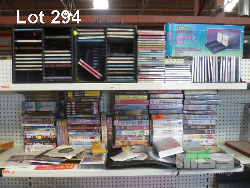 ASSORTED DVD'S, VHS TAPES, SINGLES, 2 x SHELVES