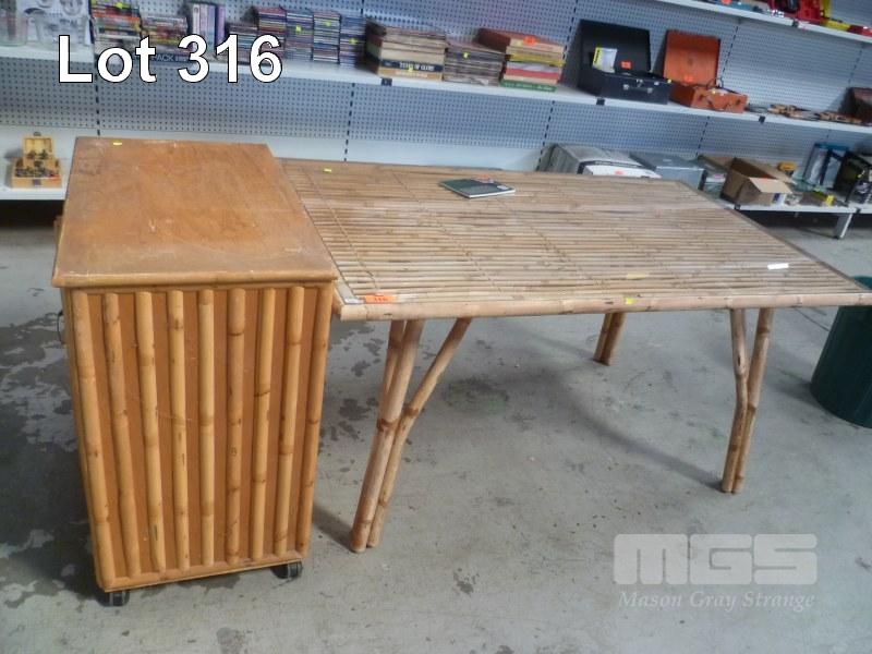 CANE RECTANGULAR DINING TABLE, GLASS TOP, 1255 x 94cm & CANE FRONTED CABINET, 2 DOOR
