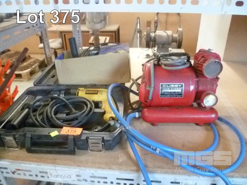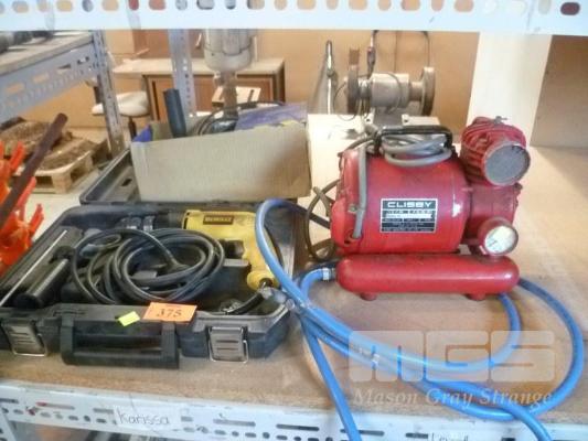 DEWALT ELECTRIC DRILL, FOREMAN ANGLE GRINDER & CLISBY PORTABLE AIR COMPRESSOR