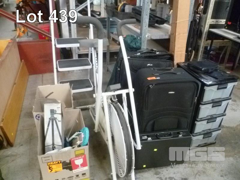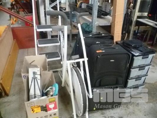 EXERCISE BIKE, SUITCASES, BRIEFCASE, HOME HARDWARE, STEPLADDER, STORAGE DRAWERS, FOLDING CHAIR, VINTAGE PROJECTOR SCREEN ETC. (INC. 2 x BOXES)