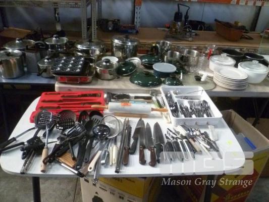 SELECTION OF ASSORTED COOKWARE, KITCHENWARE, KITCHEN KNIVES, FLATWARE, KITCHEN CONTAINERS, UTENSILS AND OTHER RELATED. (2 x TABLES & 2 x BOXES).