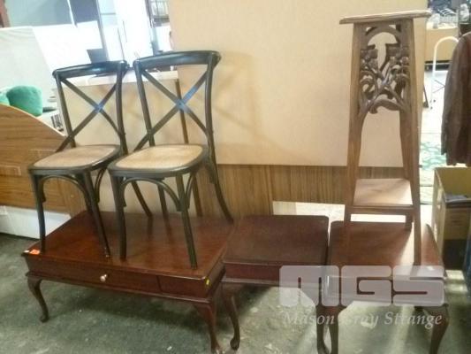 2 x RATTAN SEAT CROSS-BACK DINING CHAIRS, CABRIO LEG SINGLE DRAWER COFFEE TABLE, 2 x CABRIOLE LEG SIDE TABLES AND CARVED WOOD POT STAND/PEDESTAL.