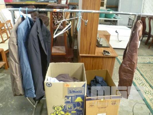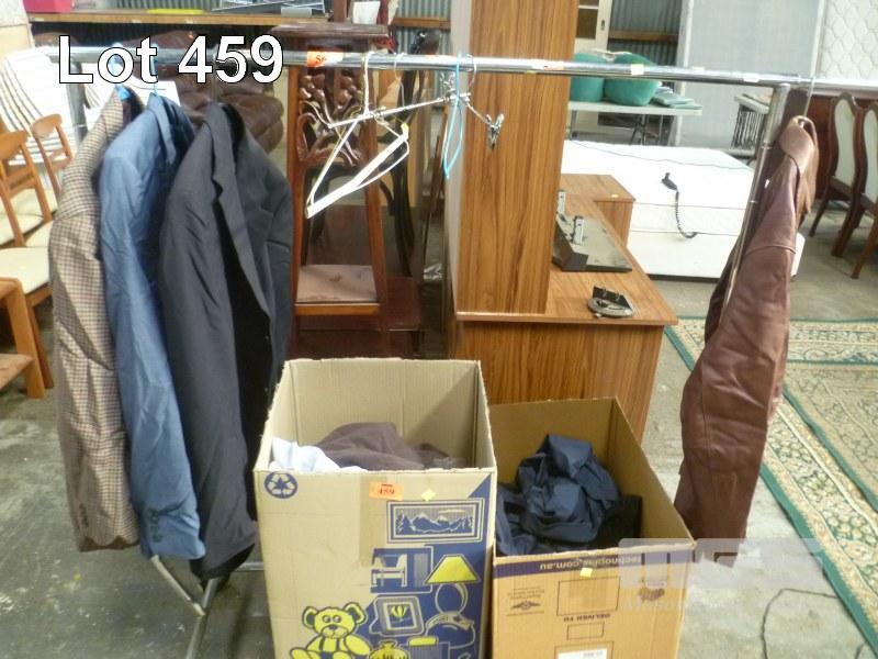 COLLECTION OF GENTLEMEN'S CLOTHING INCLUDING, SUITS, JACKETS, SHIRTS, JUMPERS AND "MONZA" ITALIAN LEATHER JACKET. (2 x BOXES AND CONTENTS CLOTHES RACK - RACK NOT INC.)