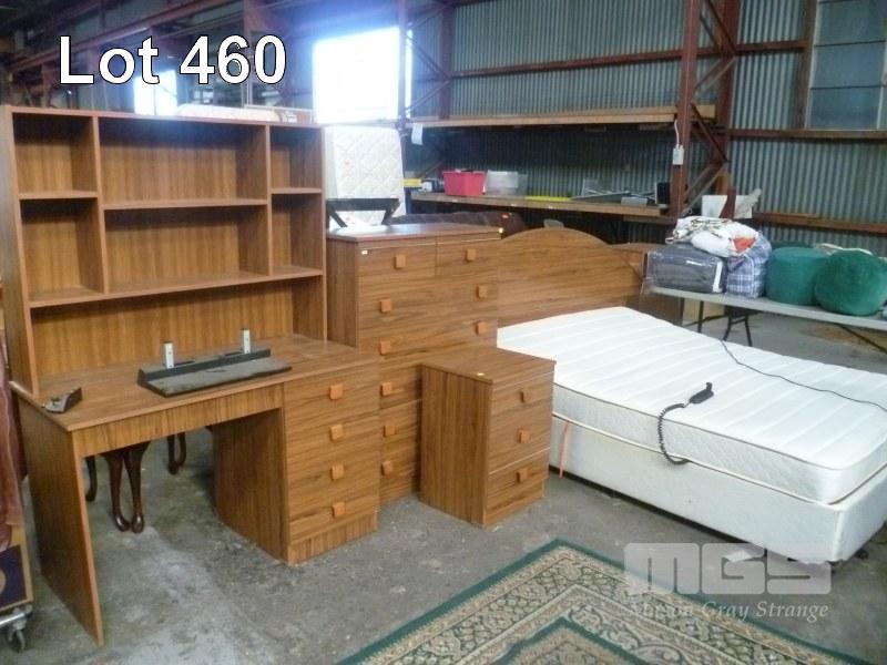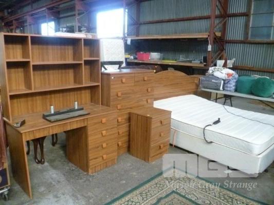 CLASSIC RETRO TIMBER LAMINATE BEDROOM SUITE AND QUEEN SIZE ADJUSTABLE ELECTRIC BED WITH MATTRESS. INCLUDES 3-DRAWER BEDSIDE TABLE, 7-DRAWER CHEST AND MATCHING 4-DRAWER DESK WITH HUTCH.
