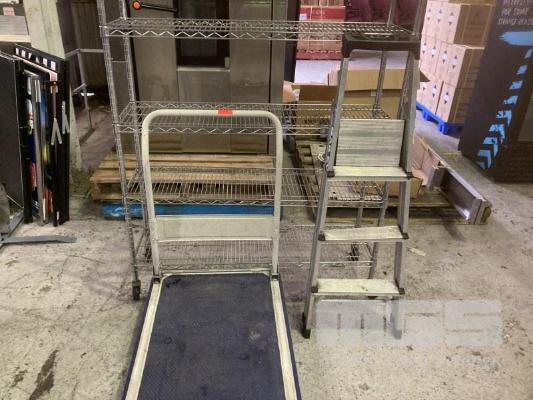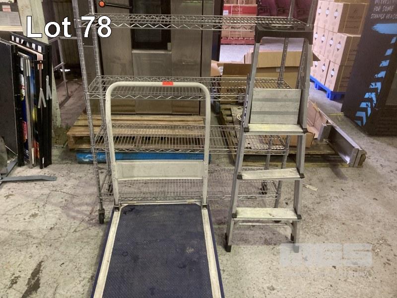 CHROME STOCK RACK, 120 x 35cm, FLAT BED TROLLEY & STEP LADDER