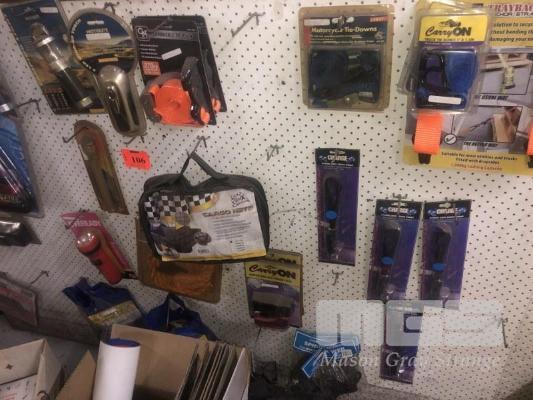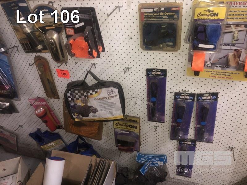 TIE DOWN RATCHET STRAPS, TOW ROPES, ELEC CLOCK, SPIDER WEB COVER & ANTI STATIC STRAP,