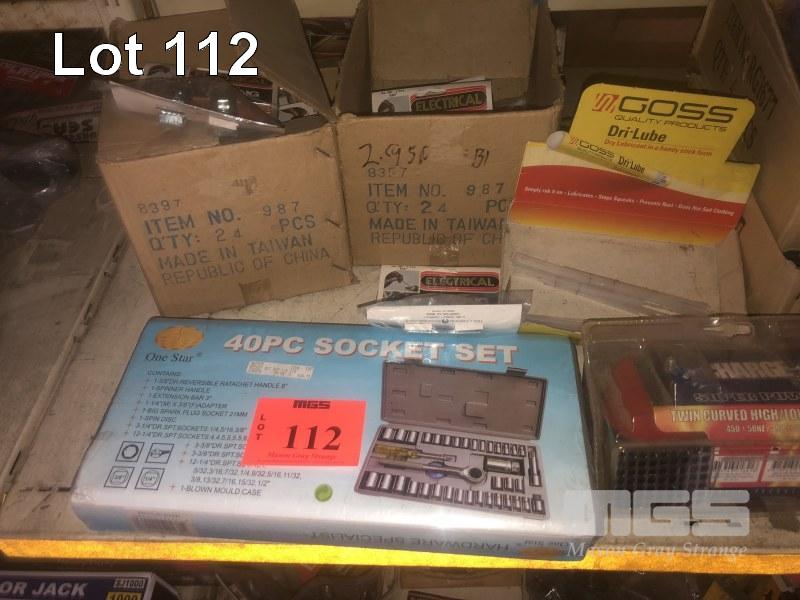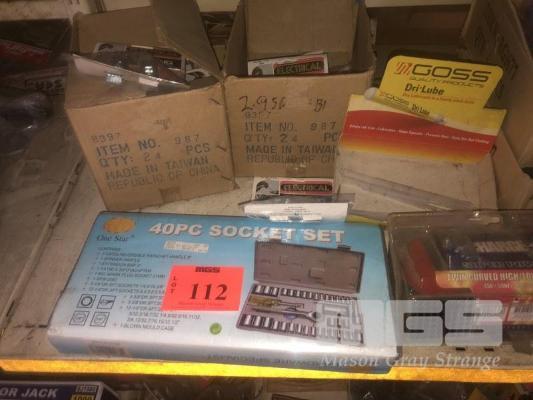 40 PIECE SOCKET SET, 2 x HORN SETS, HIGH/LOW, ELECTRIC CLIPS, TIE DOWNS & APPLICATOR GUN CONTENTS 1 x SHELF