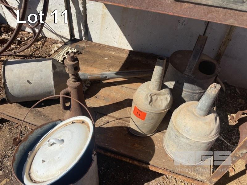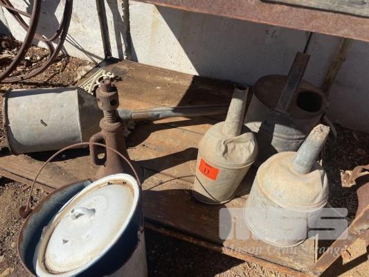 4 x GALV, SILVER SOLDERED FUNNELS, SCREW JACK WATER POT, ETC