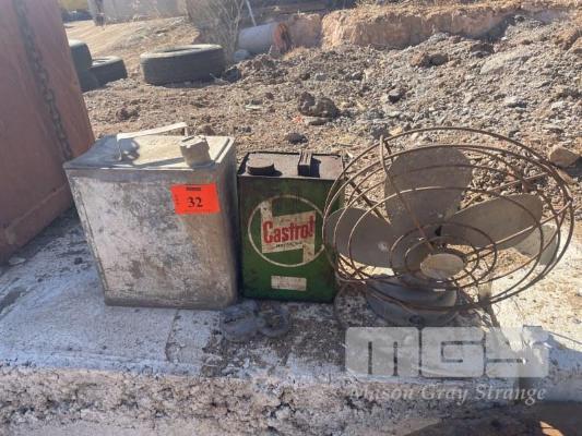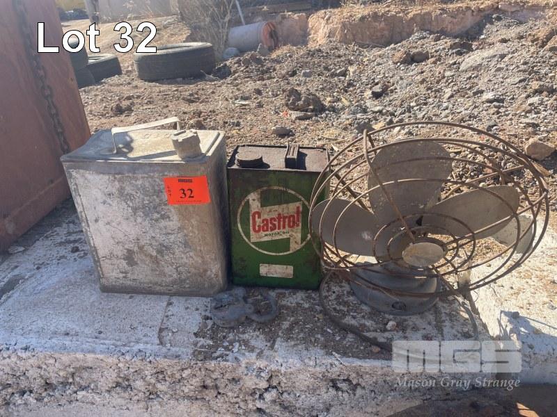 SOLDERED PETROL TIN, CASTROL TIN & DESK FAN