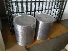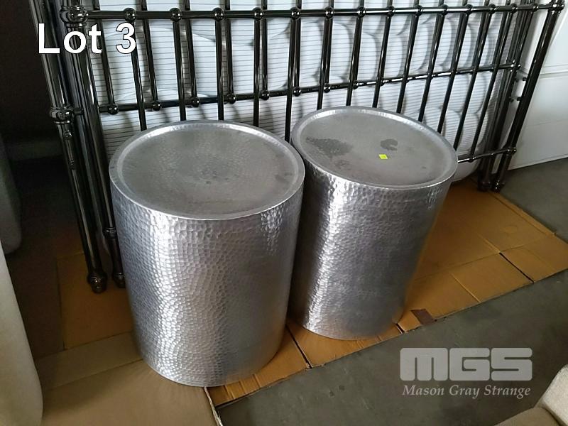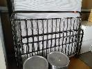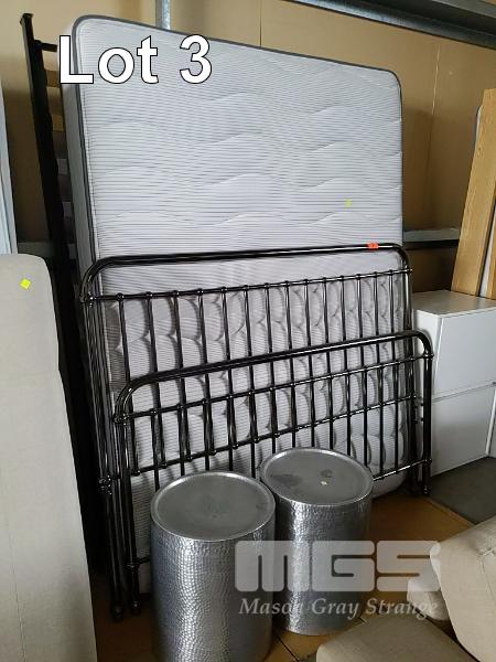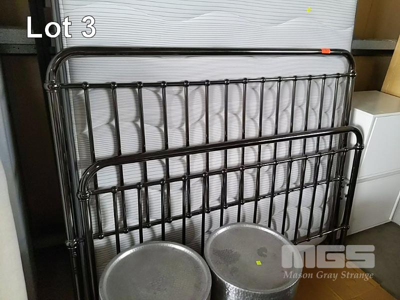 QUEEN SIZE STEEL FRAME BED WITH MATTRESS AND 2 x DIMPLED ALUMINIUM DRUM STYLE BEDSIDE SIDE TABLES.