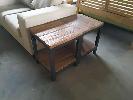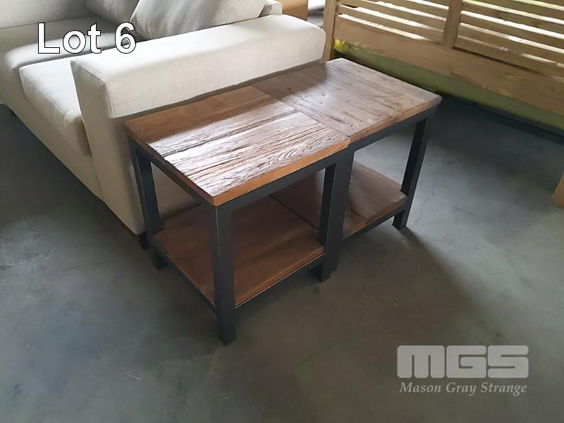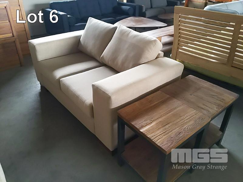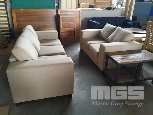 BOX ARM FABRIC LOUNGE SUITE COMPRISING 3-SEAT AND 2-SEAT LOUNGES AND 2 x RUSTIC SOLID TIMBER STEEL FRAME SIDE TABLES