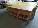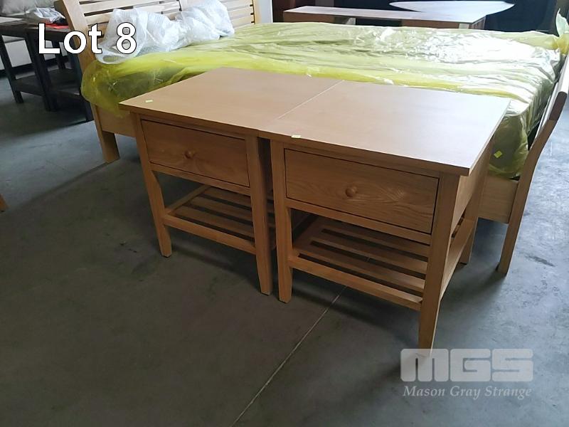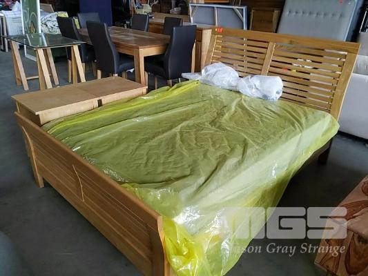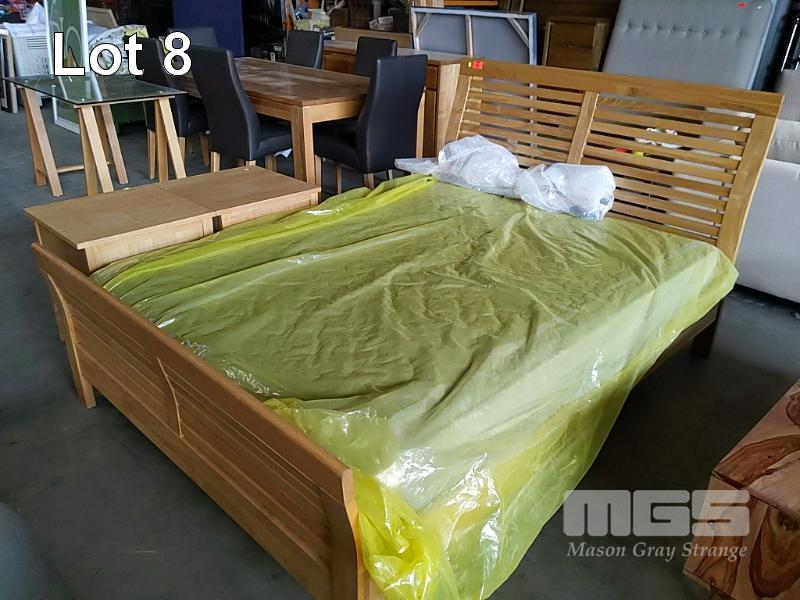 QUEEN SIZE SLAT TIMBER BED AND MATTRESS WITH MATCHING 2 x SINGLE DRAWER BEDSIDE TABLES.