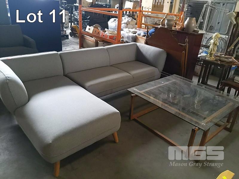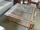 3-SEAT CHAISE FABRIC SECTIONAL SOFA IN LIGHT GREY AND GLASS TOP COFFEE TABLE ON TEAK GEOMETRIC BASE 105 x 105 CM.