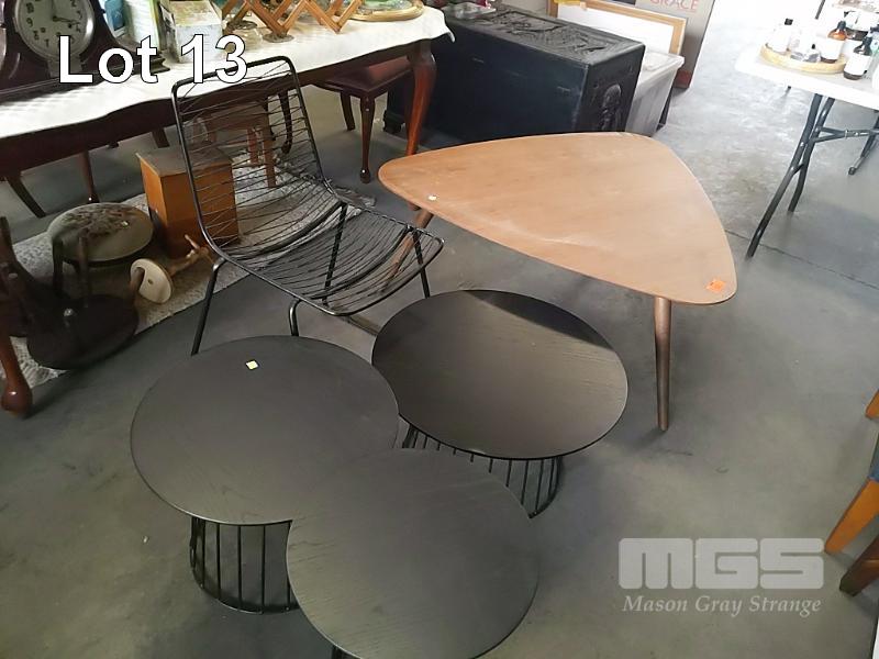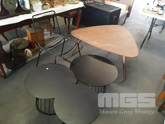 RETRO STYLE TEAK LAMINATE TRIANGULAR COFFEE TABLE, 3 x BLACK ROUND SIDE TABLES WITH WIRE BASE IN VARIOUS SIZES AND BLACK WIREFRAME CHAIR