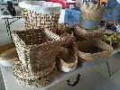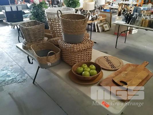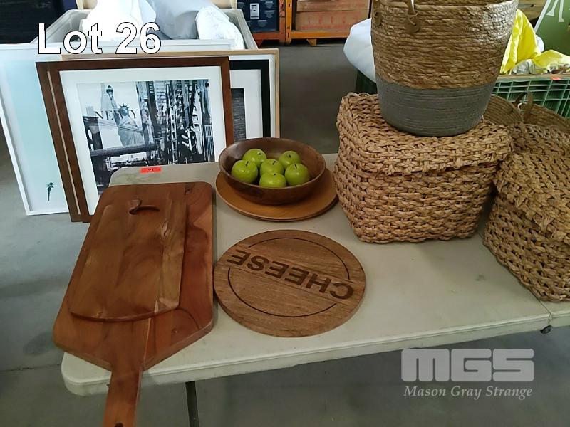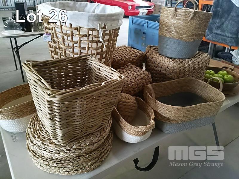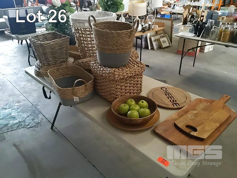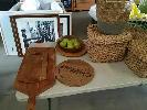 COLLECTION OF ASSORTED RATTAN BASKETS & MATS, WOODEN CHOPPING BOARDS, PLATTER & TRAYS AND FRUIT BOWL WITH FAUX APPLES (1 x TABLE).