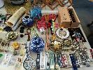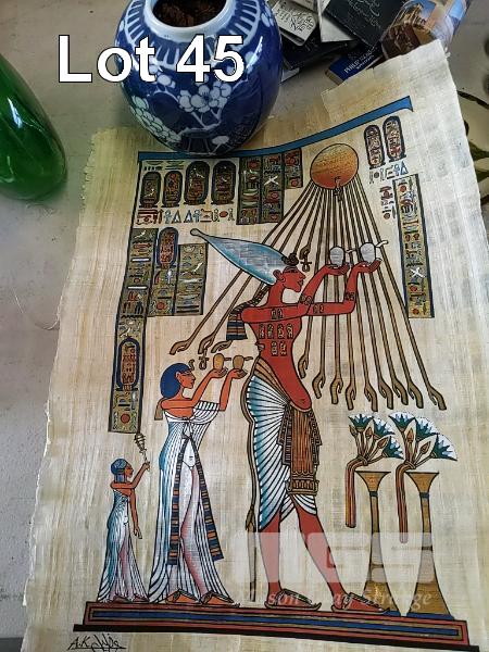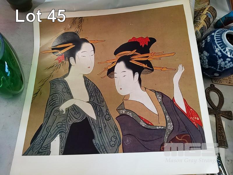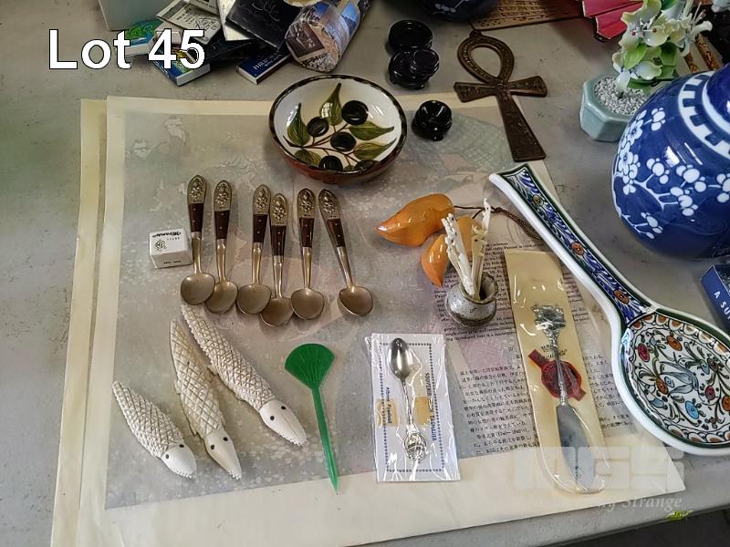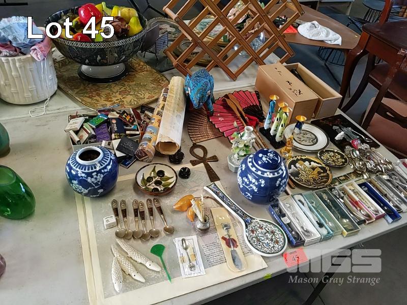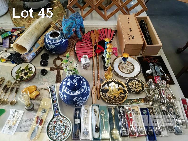 ASSORTED TRAVEL MEMENTOES AND COLLECTABLES INCLUDING MATCHBOOKS FROM AROUND THE WORLD, PAPRYUS SCROLL FROM EGYPT, JAPANESE PRINTS, SOUVENIR SPOONS, DISHES, CARVINGS, FANS AND MUCH MORE .