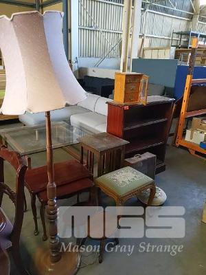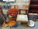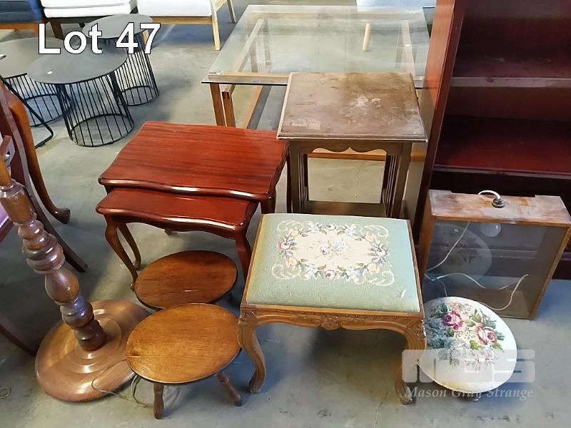 COLLECTION OF VINTAGE FURNITURE INCLUDING FLOOR LAMP, NESTED SIDE TABLES, EMBROIDERED FOOT STOOLS, BOOKCASE, SMALL CHEST OF DRAWERS WITH GLASS DOOR, LIGHT BOX ETC
