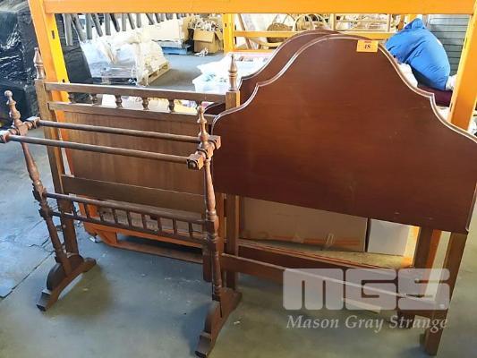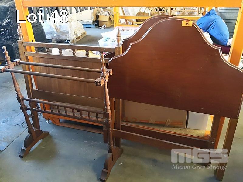 VINTAGE WOODEN SINGLE BED, BED HEADS AND LINEN RACK.