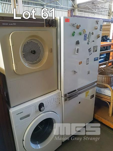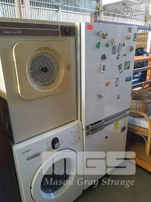 3 x WHITE GOODS. CLOTHES DRYER, FRONT LOADING WASHING MACHINE AND REFRIGERATOR FREEZER.