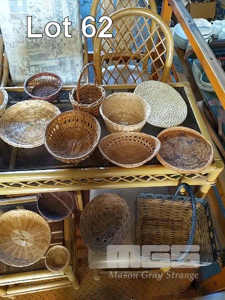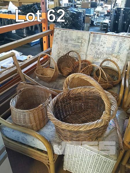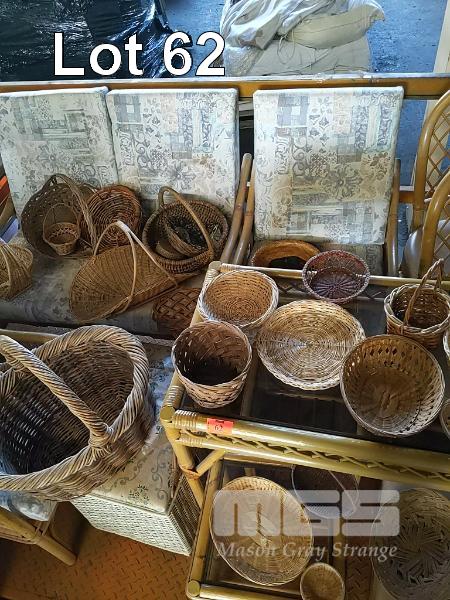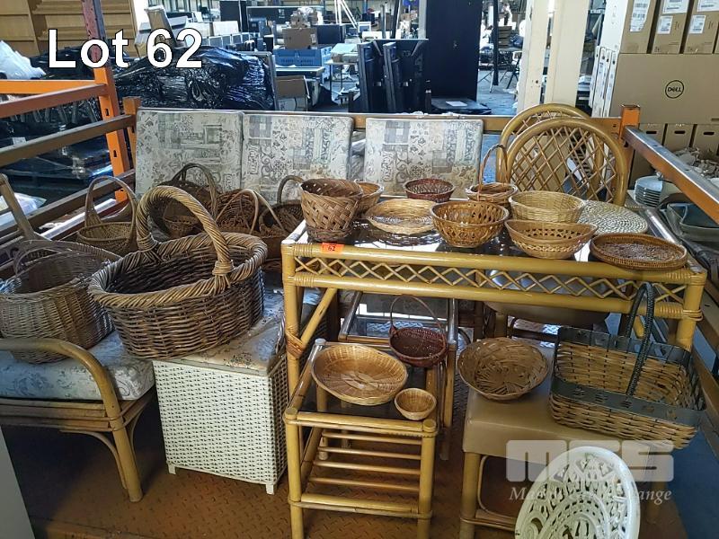 CANE FURNITURE AND QUANTITY OF WOVEN BASKETS (BAY LOT) INCLUDING CHAIRS, GLASS TOP TABLES, STORAGE BOX, FOOTSTOOL, BLANKET BEATER ETC (CONTENTS OF STILLAGE).