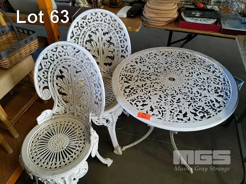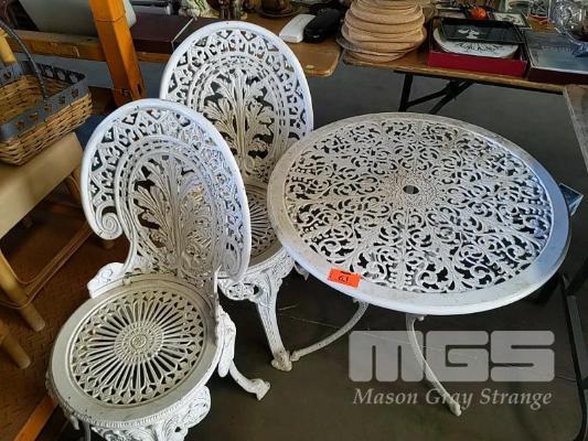CAST ALUMINIUM OUTDOOR TABLE AND 2 x CHAIRS.