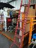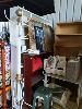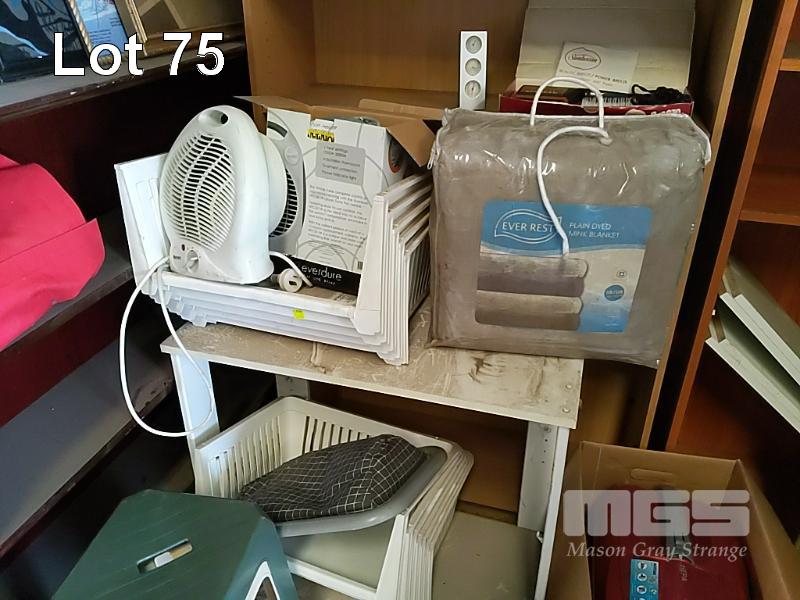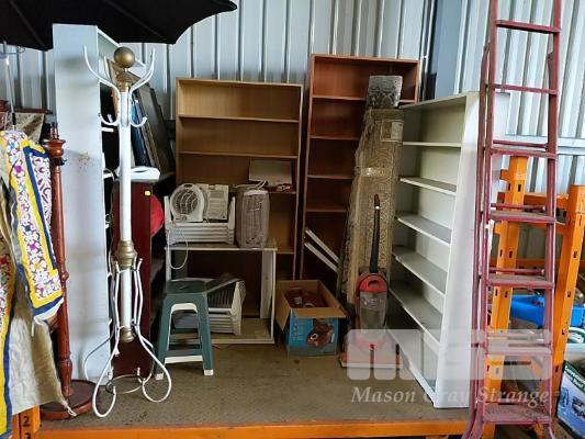 BAY LOT OF HOUSEHOLD FURNITURE AND OTHER GOODS INCLUDING BOOKSHELVES, NILFISK "HEPA" VACUUM CLEANER, HOOVER " WIDEPATH" UPRIGHT VACUUM, CLEANER, 2 x FLOOR RUGS, VINTAGE SUNBEAM HAIR DRYER WITH ORIGINAL PACKAGING, HAT STAND, FLOOR LAMP POST, EVER REST "MINK BLANKET" IN ORIGINAL PACKAGING, "L. T. KENNETT" STEEL LADDER IN RED AND MORE (1 x STILLAGE).