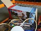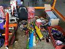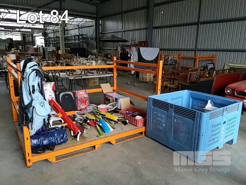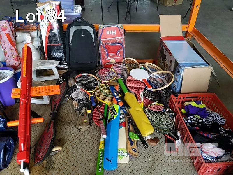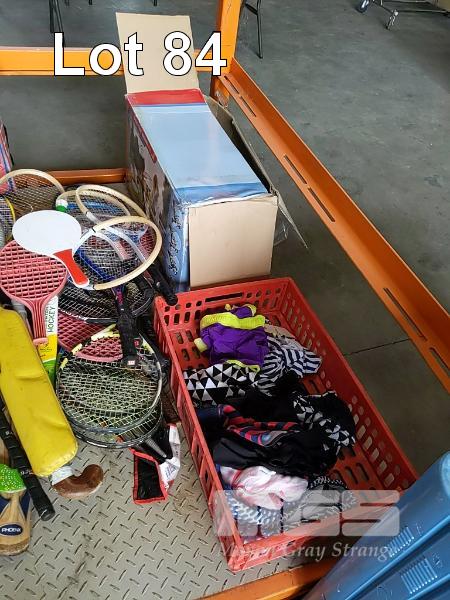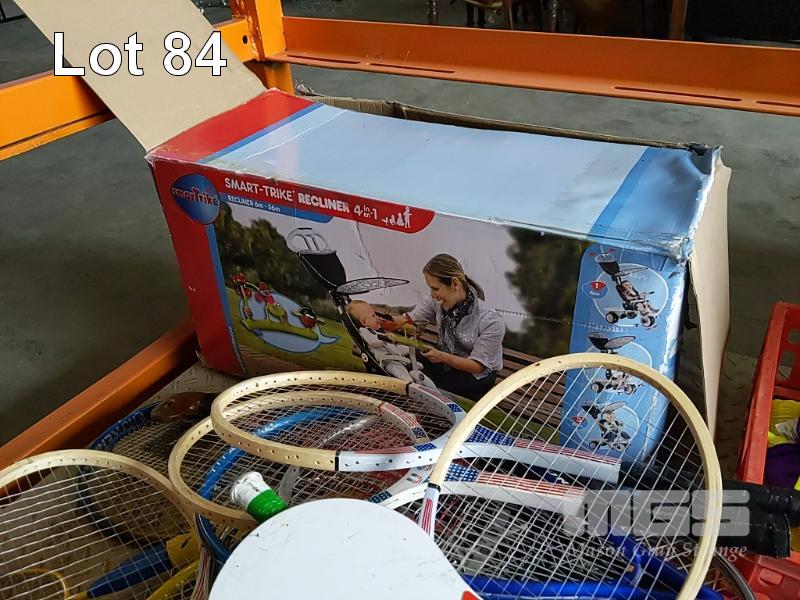 BAY LOT OF TOYS, KIDS SPORTING GEAR AND OTHER. INCLUDES LARGE QUANTITY OF RACKETS & PADDLES - TENNIS RACKETS, SQUASH RACKETS, BADMINTON RACKETS ETC, ASSORTED CRICKET BATS, HOCKEY STICKS, KIDS SUITCASES, RIPSTICK, MOP BUCKETS, SELF-INFLATING JACKAROO BLOW UP MATTRESS, LADIES SWIMWEAR, "SMART-TRIKE" RECLINER , A COLLECTION OF KIDS SMALL TOYS & AND PIECES FROM ASSORTED TOY SETS AND MORE (1 x STILLAGE + CONTENTS BLUE CRATE)