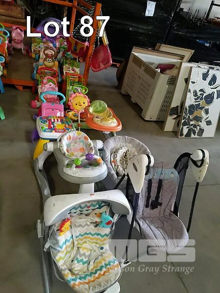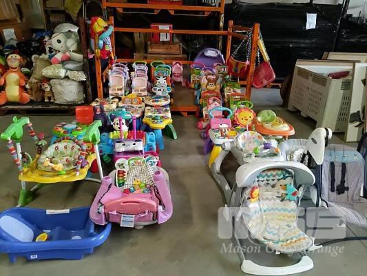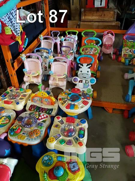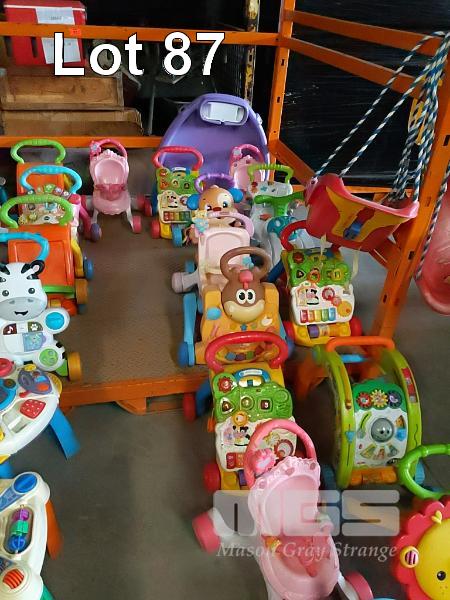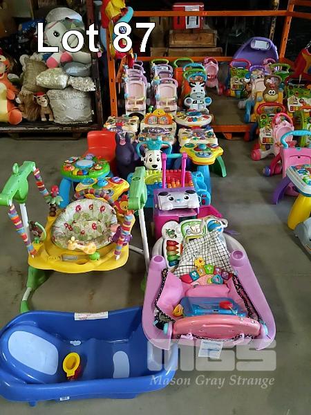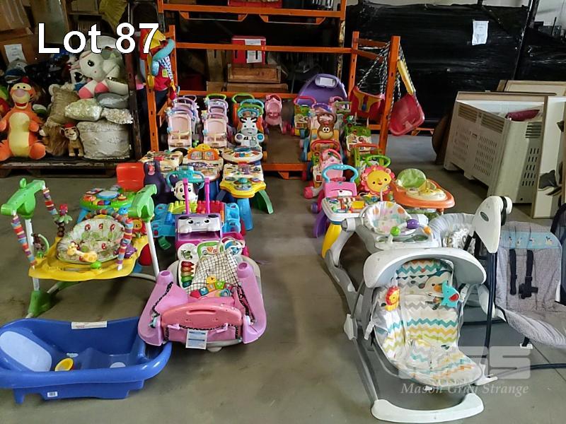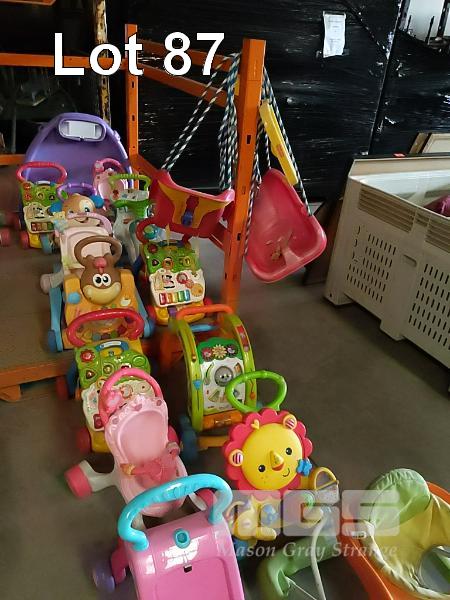 BAY LOT COMPRISING A HUGE QUANTITY OF TODDLERS WALKERS, LEARNING WALKERS , LEARNING TABLES, SWING CHAIRS, ROCKER CHAIRS AND MORE (1 x STILLAGE AND SECTION OF FLOOR IN FRONT THEREOF)