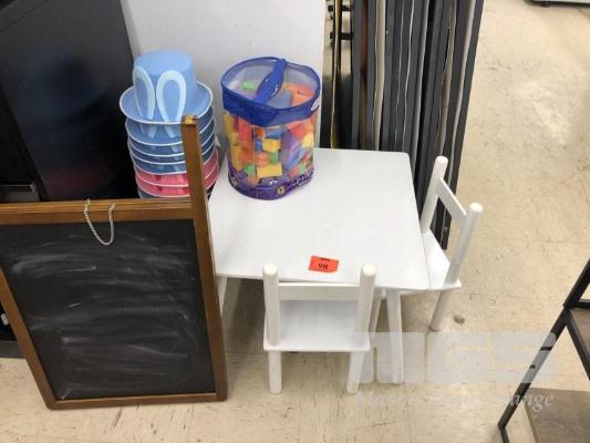 KIDS TABLE, TOYS, FILING CABINET, BLACKBOARD, ETC