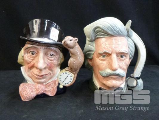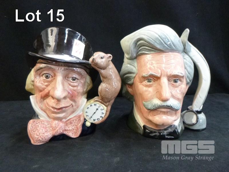 2 x ROYAL DOULTON LARGE TOBY MUGS, MAD HATTER, D6598 & MARK TWAIN, D6654