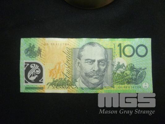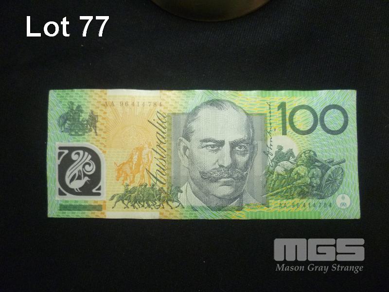 1996, AUSTRALIA, FIRST PREFIX, $100 POLYMER BANKNOTE, FRASER/EVANS, AA 96414784