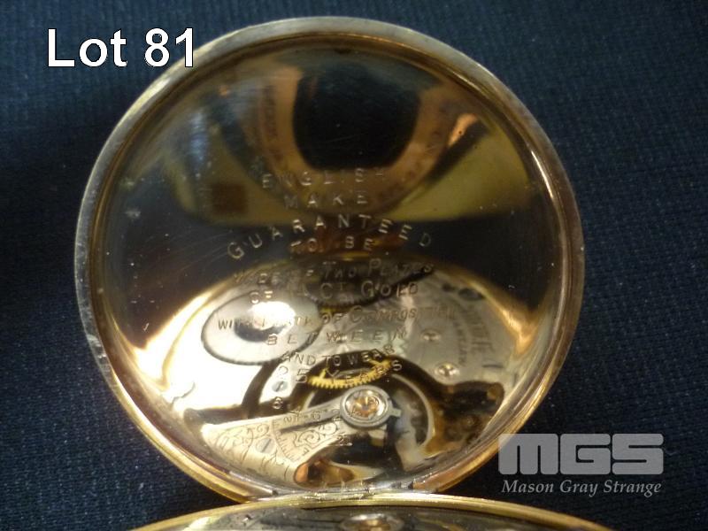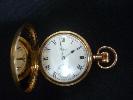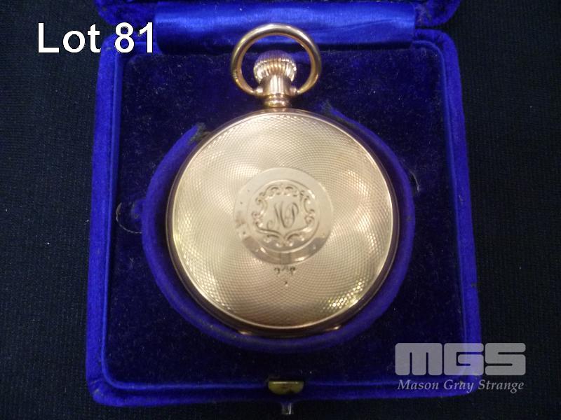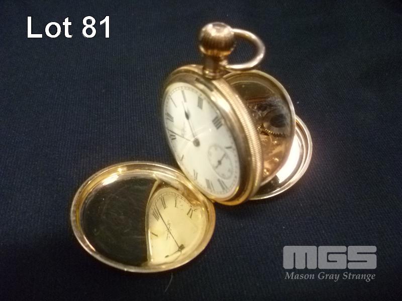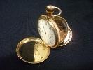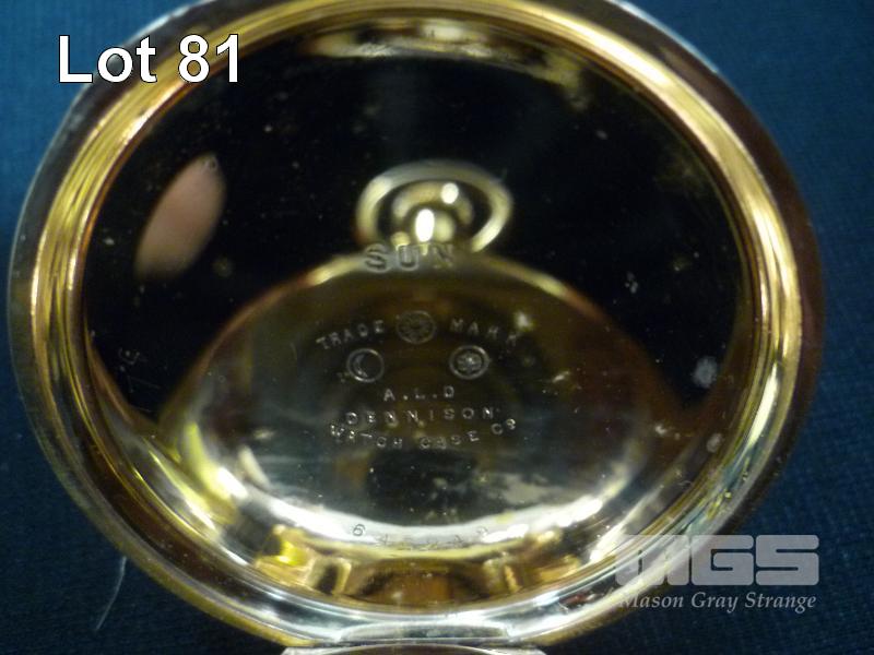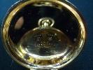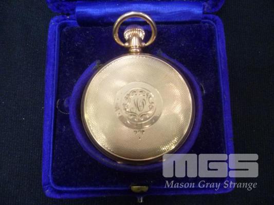 WALTHAM GOLD POCKET WATCH, MARKED 14CT, SUN DENNISON CASE Co, ENGLISH MAKE, ENAMELED FACE, 'MP' MONOGRAM ENGRAVED ON FRONT CASE, IN BLUE VELVET WATCH CASE