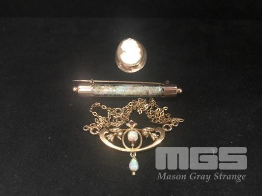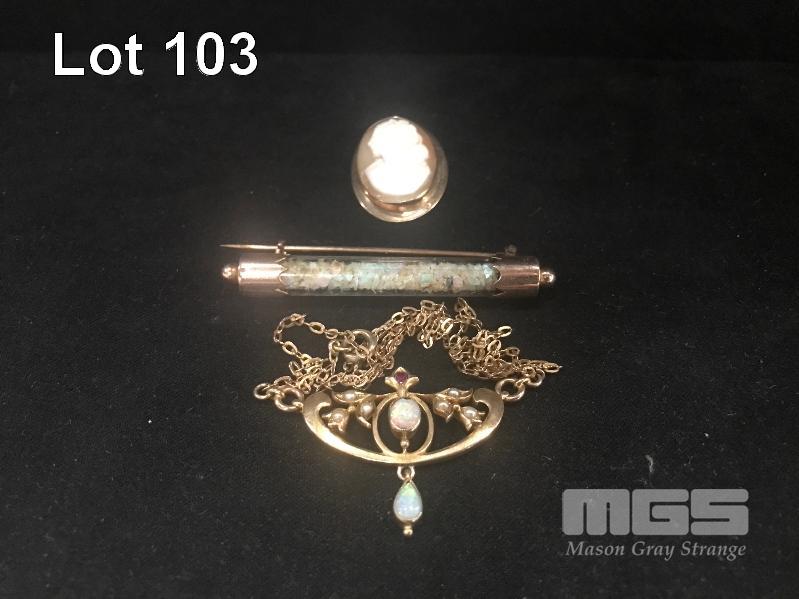 3 X 9 CT GOLD JEWELLERY PIECES INC; OPAL ENCAPSULATED BAR BROOCH, NECKLACE WITH PENDANT SET WITH 2 X OPALS & CAMEO BROOCH 12.33GM TOTAL WEIGHT GOLD WEIGHT UNKNOWN