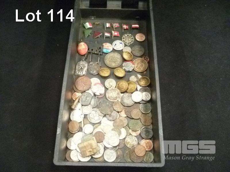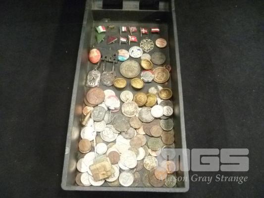 ASSORTED ENAMELED FLAG PINS, MILITARY BUTTONS, MEDALS, MEDALLIONS & WORLD COINS