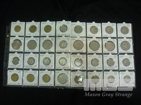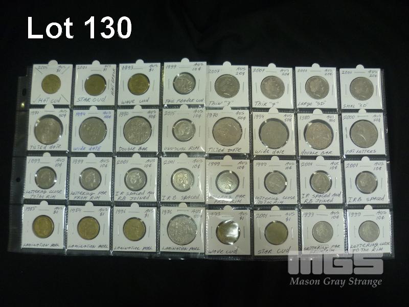 32 X AUSTRALIA, ERROR COINS, 10c, 20c, 50c, $1, INC; IRB SPACED, THIN '7', TILTED DATE, WAVE CUD, ETC