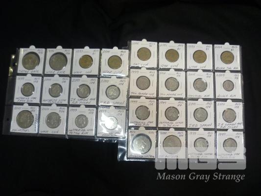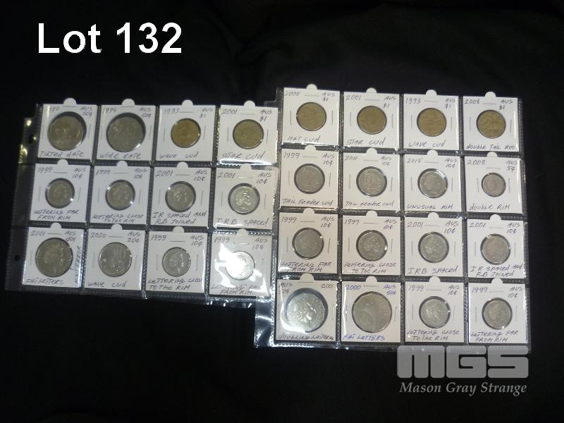 28 X AUSTRALIA, ERROR COINS, 10c, 20c, 50c, $1, INC; HAT CUD, TILTED DATE, FAT LETTERS, DOUBLE RIM, ETC