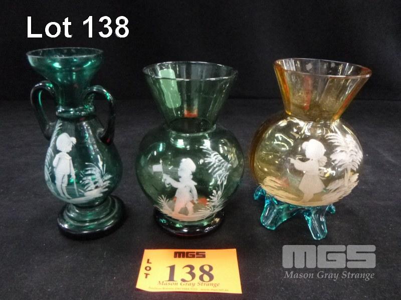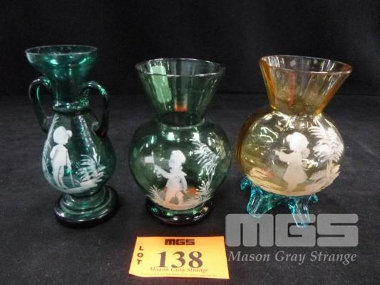 3 x SMALL MARY GREGORY GLASS VASES INC, GREEN COLOURED BOY WITH CANE, 12cm (H), GREEN COLOURED BOY WITH FLAG, 11cm (H) & ORANGE & BLUE COLOURED GIRL POINTING, 11cm (H)