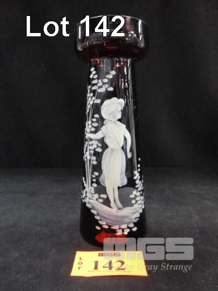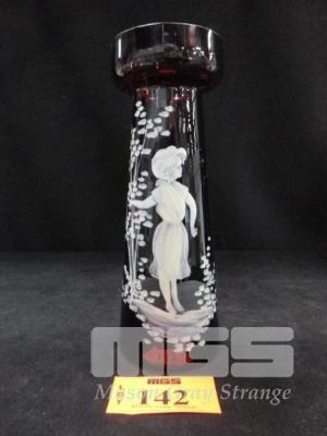 DARK RED MARY GREGORY GLASS VASE, GIRL HOLDING TREE, 20cm (H)