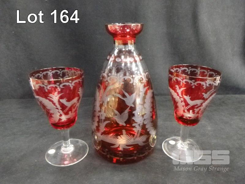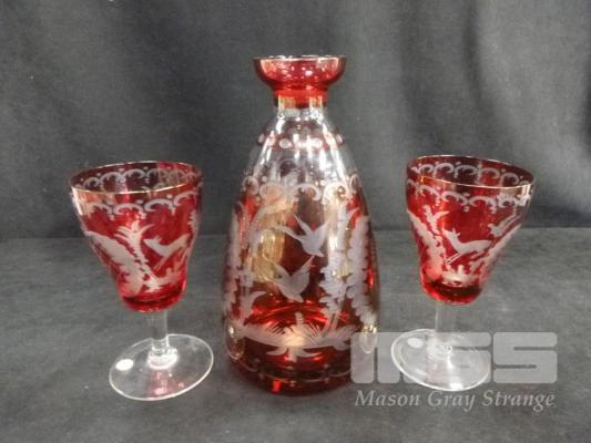 RUBY RED, CUT CRYSTAL DECANTER WITH PAIR MATCHING STEMMED GLASSES, MADE IN WEST GERMANY