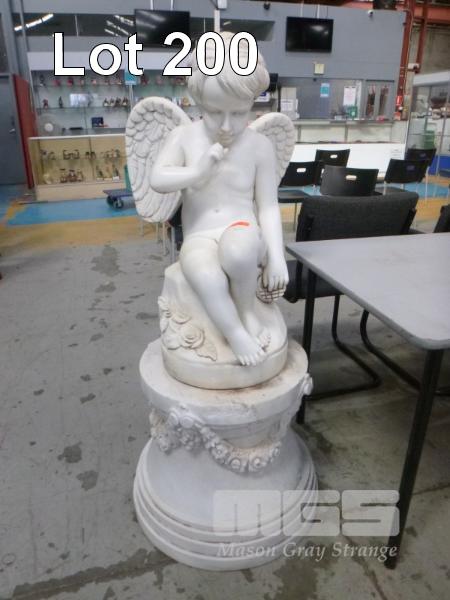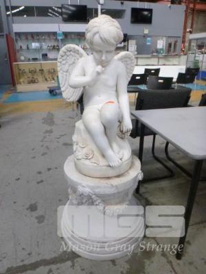 MARBLE STATUE CUPID, 85cm (MISSING INDEX FINGER & LARGE TOE) WITH MARBLE PLINTH FLORAL DESIGN, (PIECE CUTOUT ON BASE)