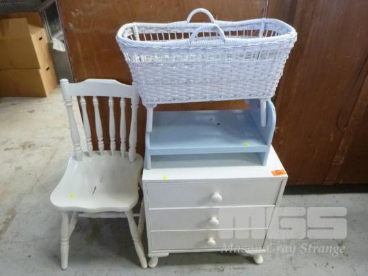 DOLLS BASINET & BED FRAME, WHITE DINING CHAIR WITH BEDSIDE CABINET