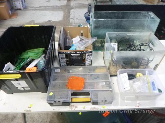 2 X GLASS AQUARIUMS WITH ASSORTED ACCESSORIES 1 X TANK 60CM (W) X 18CM (D) X 35CM (H) 1 X 40CM (W) X 25CM (D) X 28CM (H) TANK HEATERS, FILTERS, FILTER PARTS & CONSUMABLES, HANNA HI713 PHOSPHATE TESTER, PLUMBING/IRRIGATION SUPPLIES ETC
