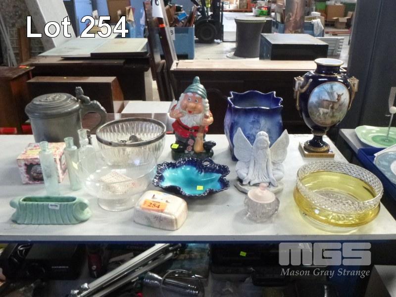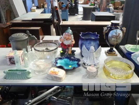 ASSORTED BOWLS, VASES, VINTAGE BOTTLES, ETC
