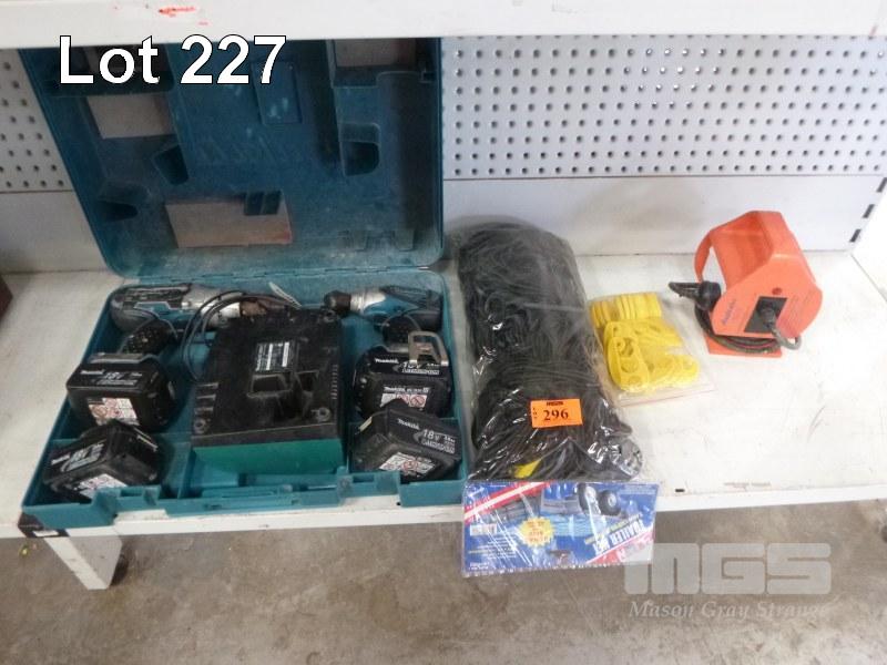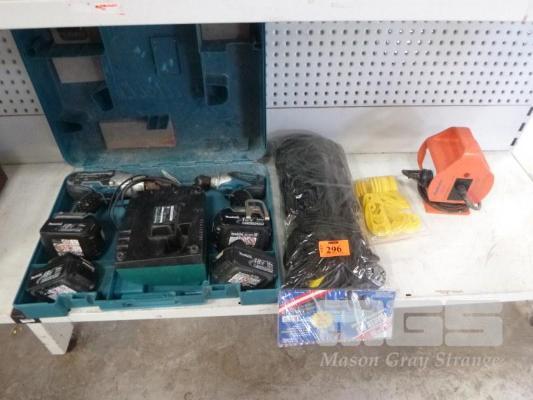 MAKITA CORDLESS DRILL, 4 X BATTERIES, CHARGER, IN CARRY CASE, WITH TRAILER NET, ETC