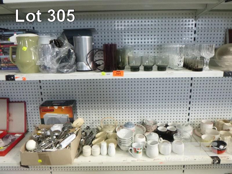 ASSORTED GLASSWARE, APPLIANCES, CROCKERY, CUTLERY, ETC, 2 x SHELVES