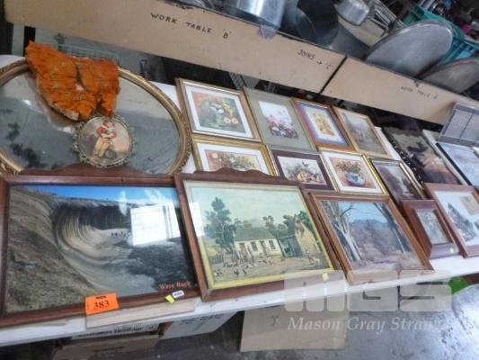 ASSORTED PRINTS, MIRROR, CLOCK & WALL ART, 1 x TABLE