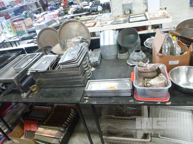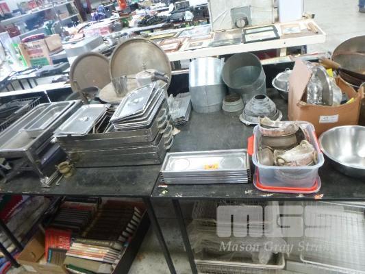 ASSORTED STAINLESS STEEL CATERING ITEMS INCLUDING CHAFFING DISH BASES & BURNER TRAYS, INDIAN COPPER PLATED SERVING BOWLS, MIXING BOWLS, TANDOOR RODS, CERAMIC & GLASS PLATES ETC