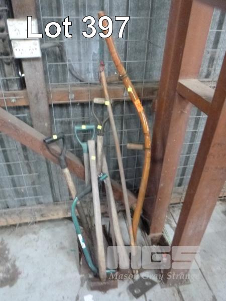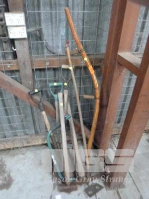 ASSORTED GARDEN TOOLS INCLUDING SCYTHE